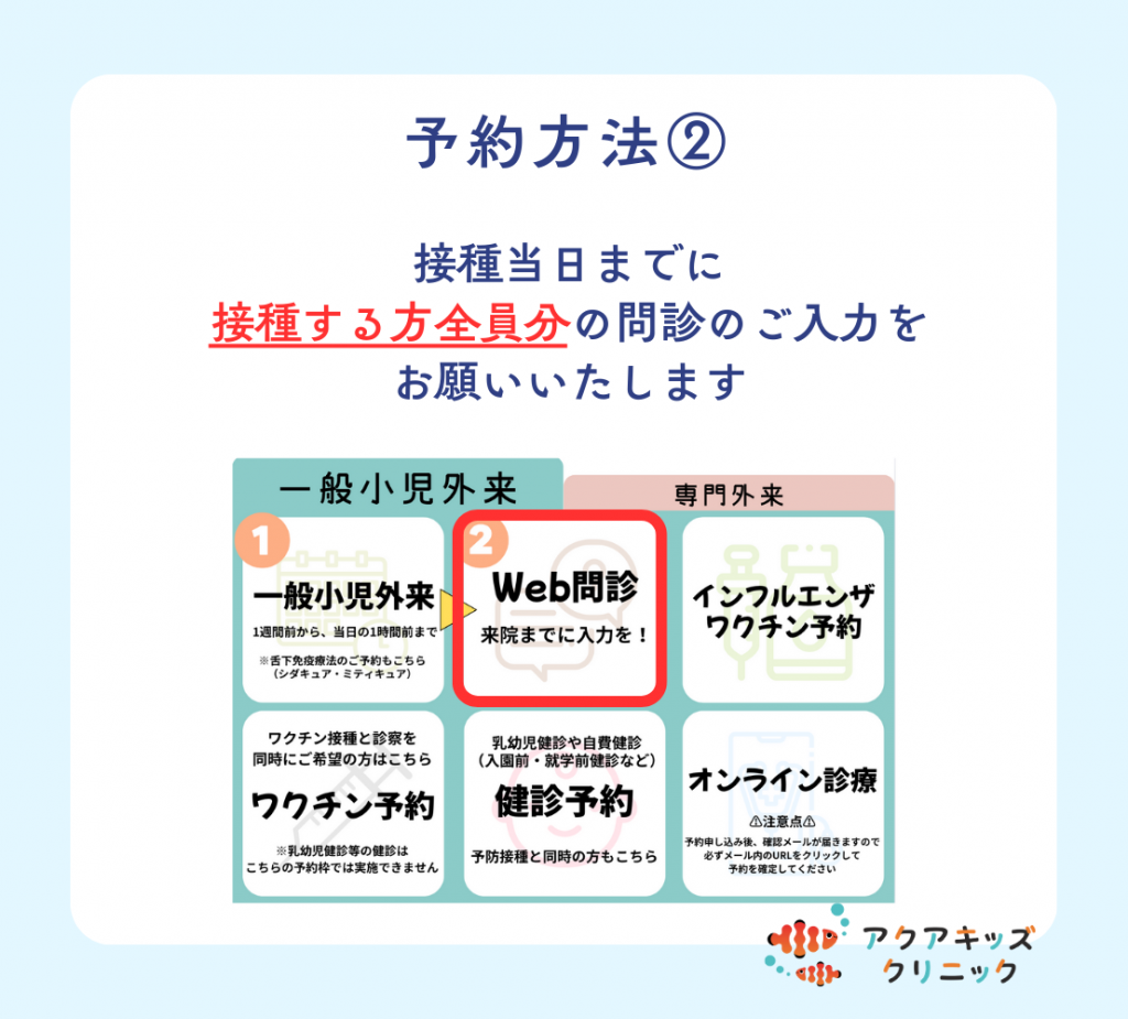 - 予診表がある方もお名前や生年月日の確認のため、Web問診をご入力のうえ、来院してください
